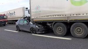 ببینید | لحظه تصادف ترسناک خودروی سواری با تریلی حین لایی‌کشی غیرمجاز در اتوبان